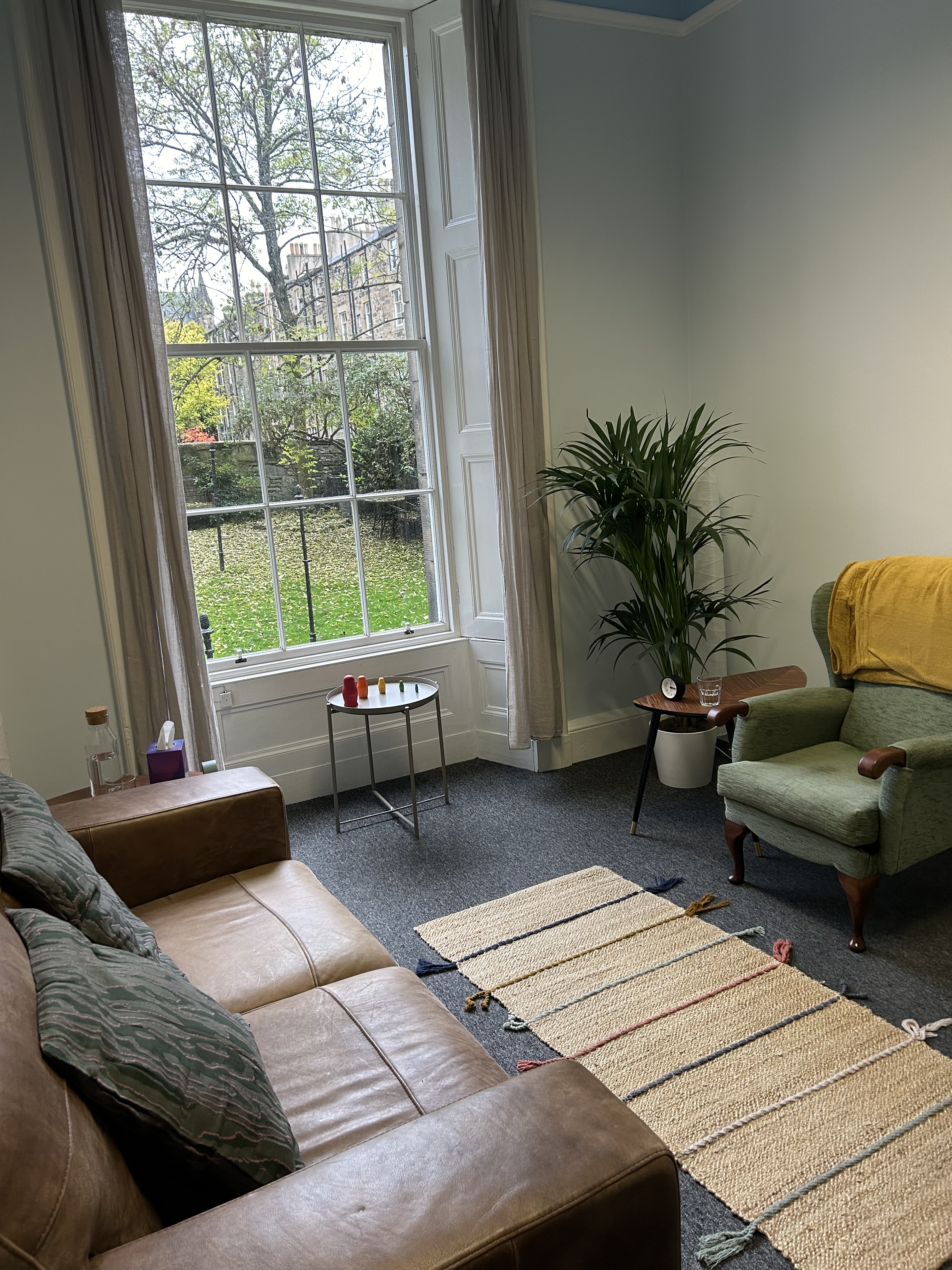 I see clients in person in Edinburgh’s West End, a five minute walk from Haymarket station and a two minute walk from a tram stop. I work Wednesday to Saturday. During the week I work both daytimes and evenings, and on Saturdays I offer morning appointments. I also offer online sessions during the same hours.